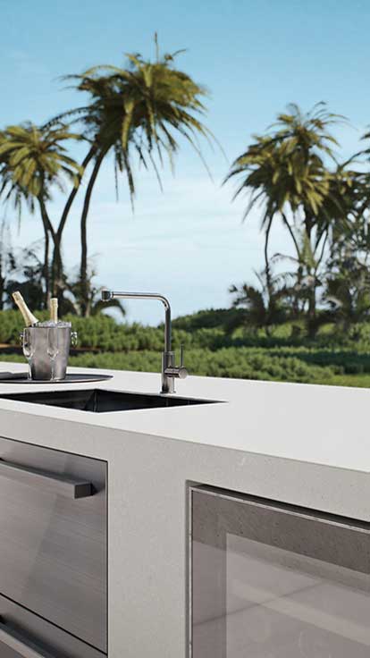 Die Outdoor-Kollektion übertrifft andere oft benutzte Outdoor-Materialien in standardisierten Tests und verleiht Outdoor-Küchen und modernen Gärten die Kontinuität von Schönheit, Stärke und Haltbarkeit.