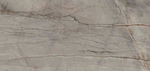 Eine rauchgraue Basis, verwittert wie ein Felsen und wie ein Fossil, eine geologische Landschaft, die als Oberfläche zum Leben erwacht. Ihre starke erdige Präsenz spiegelt sich in einer komplexen Struktur aus feinen dunklen Adern in der Mitte und ausgeprägteren Linien an anderen Stellen wider, die durch Patina-Flecken, verrosteten Schlamm, kreideweiße Streifen und verbrannte orangefarbene Markierungen betont werden, in ultragrober Ausführung.