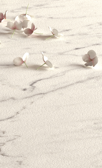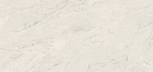 Ein weißer Grundton mit einem hellgrauen Unterton, der von weichen, federartigen Grautönen und dunklen Markierungen durchzogen ist, die durch dunklere Streifen und hellere weiße Adern akzentuiert werden und eine sehr gefühlvolle Präsenz erzeugen.