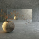 Eine üppige perlgraue Basis, sanft gemustert und aus mehreren Schichten aufgebaut, mit sanften bläulichen Untertönen, zart berührt von der dynamischen Tiefe der federleichten Meerschaum-Aderung und subtilen dunkelgrauen Schatten, die mit erdigen Spuren und salbeifarbenen Akzenten getönt sind, in geschliffener Ausführung.