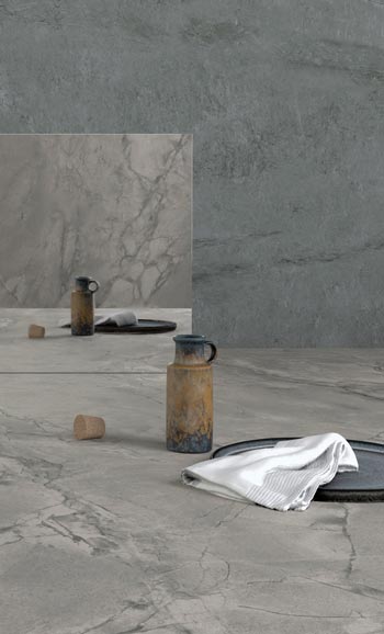 Eine elefantengraue Basis mit sanften, gebrochenen weißen Markierungen, kombiniert mit den oxidierten Aspekten des Steins, der rauen Maserung und den dunkelgrauen Äderungen, die die organischen Texturmuster des Natursteins bilden, in ultragrober Ausführung.