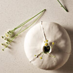 Eine rein weiße Basis, gemischt mit durchscheinenden Kristall-Partikeln, die im Einklang mit weichen grauen Flecken funkeln.