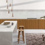 In einem hellen, minimalistischen Raum dominieren gerade Linien und eine Reihe natürlicher Materialien, die die Struktur der Oberfläche mit einem harmonisch-natürlichen Look ergänzen.