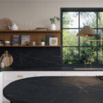 Impermia nimmt einen monochromen Charakter an, wenn es mit dunklen Beschlägen, Möbeln und Schränken kombiniert wird, oder bleibt nüchtern, wenn es mit hellen Böden kontrastiert wird. Es dient als Plattform zur Erhöhung der Arbeitsplatte, akzentuiert durch gebürstetes Gold oder Bronze und geschmückt mit frischen und hellen Lebensmitteln.
