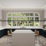 Die intensiv weiße Basis verleiht der Küche ein frisches und elegantes Flair. Die übergroßen Aderstrukturen sind in Abständen angelegt und lassen graue und ockerfarbene Sprenkel erkennen, die schwachen Umrissen von Bergspitzen gleichen, die vom geschmolzenen Schnee freigelegt wurden.