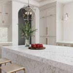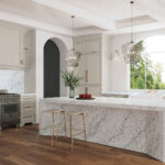 Eindrucksvoll und lebendig, kreativ und unvergesslich mit gebürstetem Gold oder verchromten Beschlägen, und elegant mit Edelstahl. Dunkle oder schwarze Schränke kontrastieren mit den helleren Tönen, während cremefarbene Wände und Fußböden den Raum in der Schwebe halten. Ein anspruchsvoller Trend bei Möbeln aus Walnussholz vereint die reiche Maserung des Holzes mit der Schönheit der Platte.