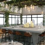 Ein trendiger urbaner Raum eröffnet sich zwischen dem Panoramablick auf die Stadt im Freien und dem inspirierenden Innenraum, der mit minimalistischen Möbeln inmitten von rohem Sichtbeton und Grünflächen ausgestattet ist.