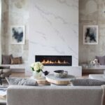 Klassisches Design mit modernen Linien, die es dem spektakulär geäderten Stein ermöglichen, eine Schlüsselrolle bei der Verkleidung des Kamins zu spielen, was zu einem zeitlos warmen und angenehmen Raum führt.