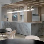 Ein zartes und präzises Esszimmer, das durch die große, den Raum dominierende Insel harmonisiert wird, deren natursteinähnliche Oberfläche die Farbtöne des Raumes vereint.
