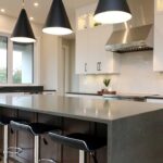 Dieser moderne, minimalistische Raum stellt den rauen, dunklen Stein mit der Glätte der weißen Schränke, die durch eine stilvolle Pendelleuchte hervorgehoben werden.