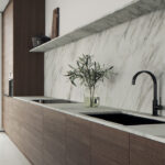 A soft ivory-white base subdued by a striking flow of grey veins that dissolve into the stone,...