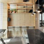 Nordische Elemente prägen diesen akkuraten und jugendlichen Raum, in dem das natürliche Sonnenlicht genutzt wird, um die schlichten Materialien wie Birkenholz und weiße 15x15-Keramikfliesen zu beleuchten, zusammen mit Schwarz-, Weiß- und Grautönen, die sich gut mit der Vegetation kombinieren lassen und einen zusätzlichen natürlichen Farbakzent setzen.