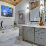 Ein luxuriöser, klassischer Raum mit den beliebten getäfelten Schrankfronten, speziellen Spiegelausschnitten, einzigartigen Wandverkleidungen und reichhaltigen Schmiedearbeiten, die sich um eine elegante Oberfläche zu einem wunderbar stilvollen Raum verweben.