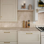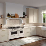 Eine klassische dreiseitige Küche in Elfenbein- und Goldtönen strahlt ein Gefühl von luxuriöser Geräumigkeit aus; eine Kombination aus Oberschränken und offenen Regalen bietet eine praktische Lösung für Aufbewahrung und Gestaltung.